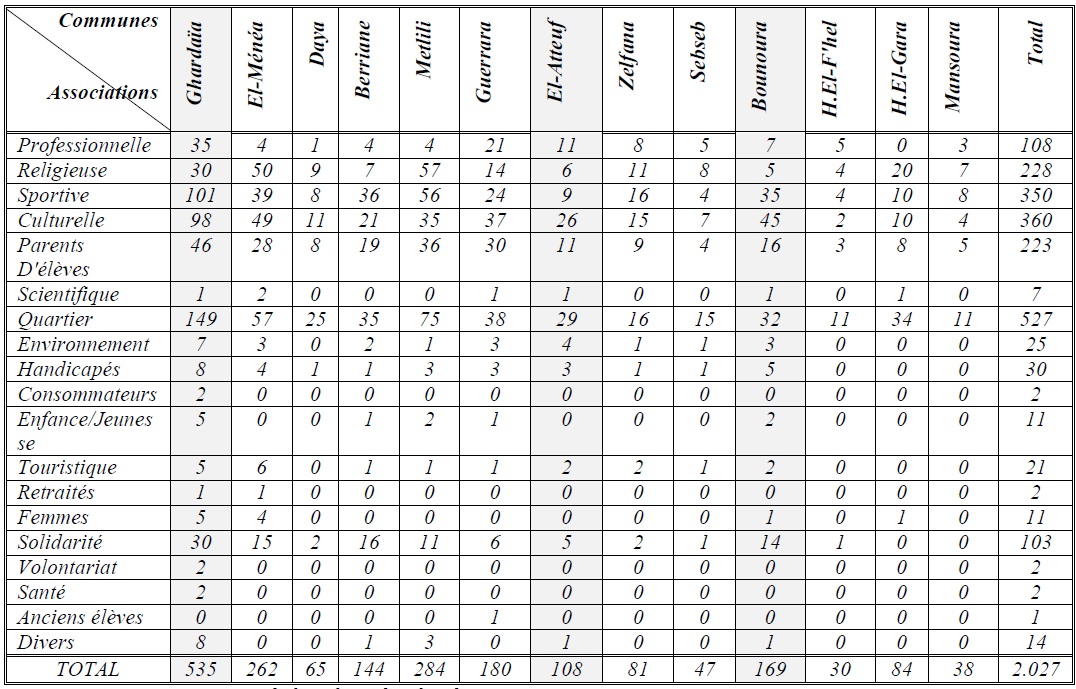 Annexe 4 : Liste des associations locales par commune et par activité au niveau de la wilaya de Ghardaïa (Situation au 31.12.2009 recueillie au niveau de la DPAT de la Wilaya de Ghardaïa) admin 13 ans ago Source : DPAT de la wilaya de Ghardaïa Page suivante : Annexe 5 : Etat des PPDRI validés au niveau de la vallée du Mzab (Année 2009)Retour au menu : EFFETS DES ACTIVITES DES ASSOCIATIONS LOCALES SUR LE PROCESSUS DE DEVELOPPEMENT DE LEUR TERRITOIRE : CAS DE LA VALLEE DU MZAB