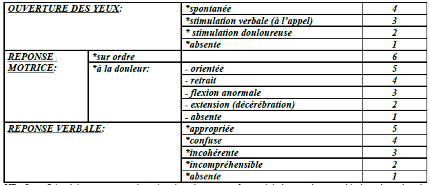 (*) GLASGOW COMA SCALE (G.C.S : 3 à 15) :