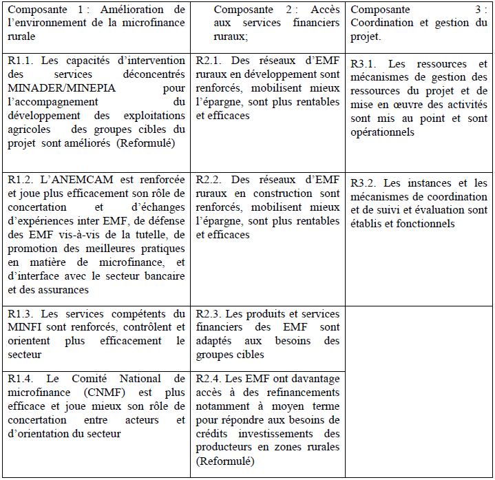 Le projet s’articule autour de trois composantes : (i) Amélioration de l’environnement de la microfinance rurale; (ii) Accès aux services financiers ruraux; et (iii) Coordination et gestion du projet.