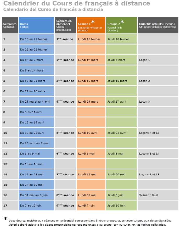 Annexe 4 : Progression pédagogique et la distribution temps-leçons-séances présentielles admin 13 ans ago Page suivante : Annexe 5 : Liste des activités à corriger/ évaluer par les tuteursRetour au menu : Gestion des interactions dans un dispositif hybride : rôles et stratégies des tuteurs. Le cas du présentiel réduit de l’Alliance française de La Havane