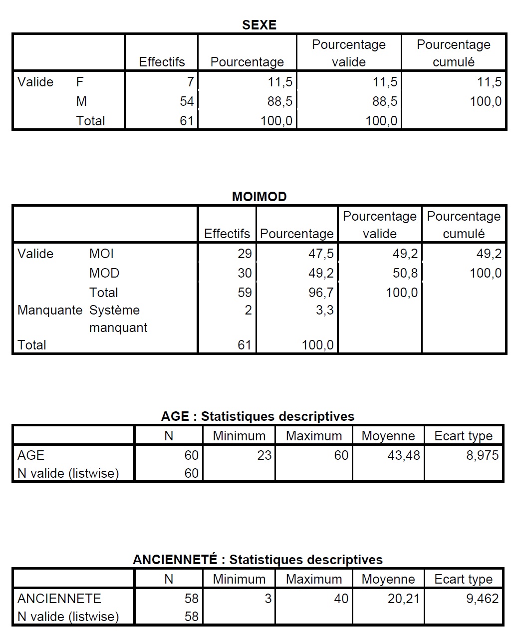 ANNEXE 4 : Tableaux statistiques, Caracteristiques de l’echantillon, SPSS. admin 13 ans ago Retour au menu : VISTEON : L’EPOPEE D’UNE RESTRUCTURATION