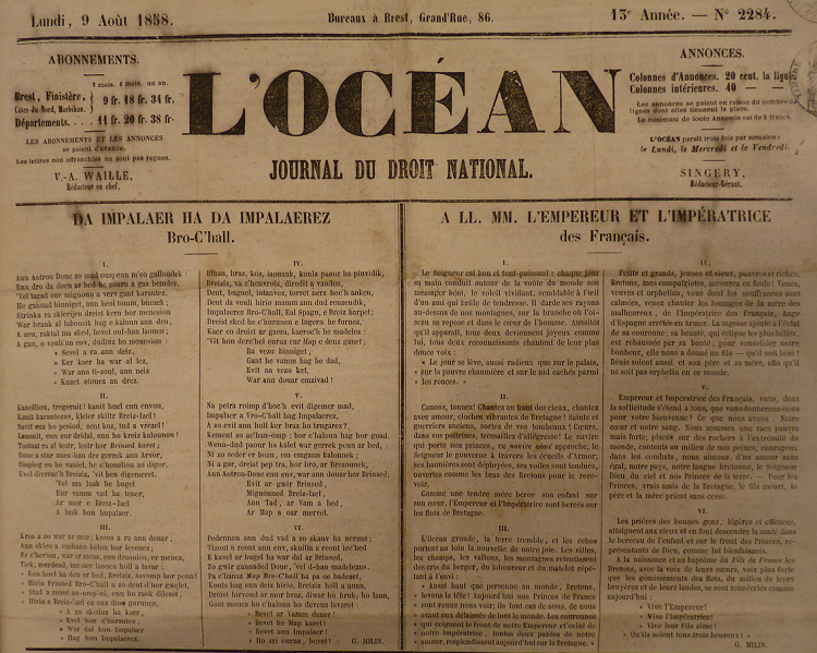 Annexe 4 : « Une » de l’Océan du 9 août 1858 admin 12 ans ago Page suivante : Annexe 5 : Feuilleton de l'Océan du 7 novembre 1860Retour au menu : Brest et la langue bretonne au XIXe siècle : La colonie française face à l’observation de la sociolinguistique historique