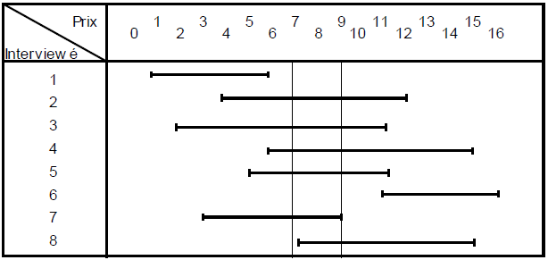 L’exemple ci-dessus montre que la zone de prix comprise entre 7 et 9 représente le cas le plus cité. Cette technique montre le prix qui permet d’obtenir la plus grande part de marché. De la même façon, en multipliant pour chaque prix la marge unitaire par la quantité vendue, on peut obtenir le prix qui maximise le bénéfice total de la production.