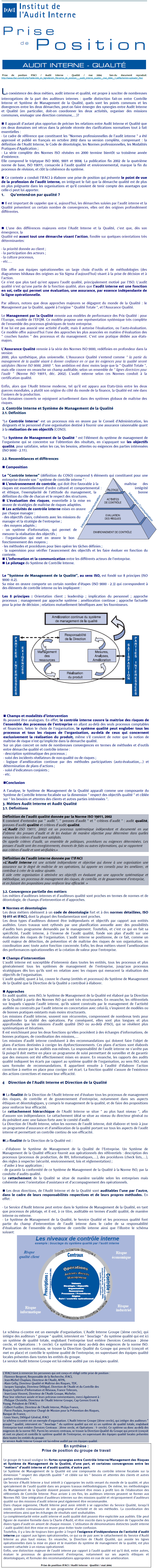ANNEXE 5 – IFACI – Prise de position – Audit et qualité – Mai 2004 admin 13 ans ago Retour au menu : L’audit interne, facteur de performance dans l’entreprise ?