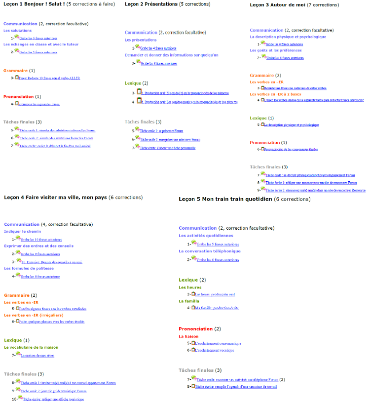Annexe 5 : Liste des activités à corriger/ évaluer par les tuteurs admin 13 ans ago Page suivante : Annexe 6 : Cours de français à distance/contenu du coursRetour au menu : Gestion des interactions dans un dispositif hybride : rôles et stratégies des tuteurs. Le cas du présentiel réduit de l’Alliance française de La Havane