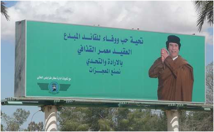 Message d’accueil à l’entrée de Tripoli : « Salutations ! Plein d’amour et de fidélité au guide, le colonel Mouammar Kadhafi, avec la volonté et l’esprit de relever le défi. On créera des miracles. »