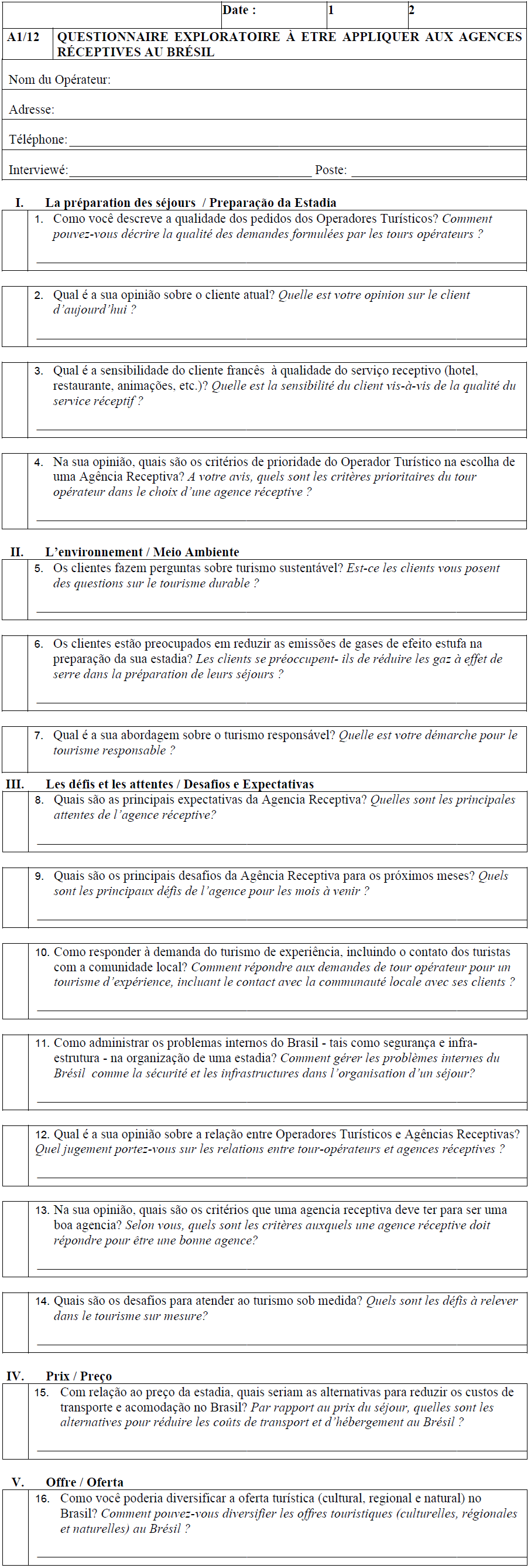 ANNEXE 5 : Questionnaire exploratoire aux agences réceptives au Brésil admin 13 ans ago Page suivante : ANNEXE 6 : Questionnaire exploratoire aux tours opérateurs en FranceRetour au menu : La place de l’hospitalité dans une prestation touristique sur mesure : Cas de la relation entre les tours opérateurs en France et les agences réceptives au Brésil