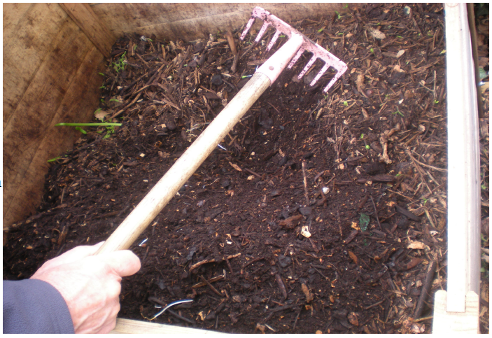 Christian qui s’apprête à retourner le compost pour mélanger la matière fraîche à la matière