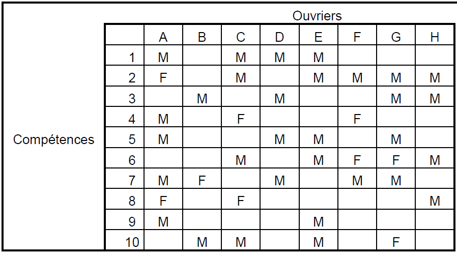 La grille de compétence est un tableau qui regroupe les ouvriers de l’atelier et les compétences requises pour travailler dans cet atelier. On y indique par un M les compétences maîtrisées par les ouvriers – c’est-à-dire pour lesquelles les ouvriers ont fait leurs preuves – et par un F les ouvriers qui ont suivi la formation de compétence mais ne l’ont pas encore pratiqué sur le lieu de production.