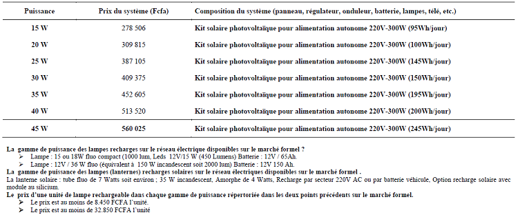 Annexe 6 : Les données collectées précédemment indiquent une puissance minimale de 50 W pour les panneaux solaires au Cameroun. admin 12 ans ago Page suivante : Annexe 7 : Définition des unités de mesure et de comptabilité énergetiqueRetour au menu : STRATEGIE DE CROISSANCE DES UNITES TERRITORIALES DU CAMEROUN, PRODUCTION DECENTRALISEE D’ELECTRICITE