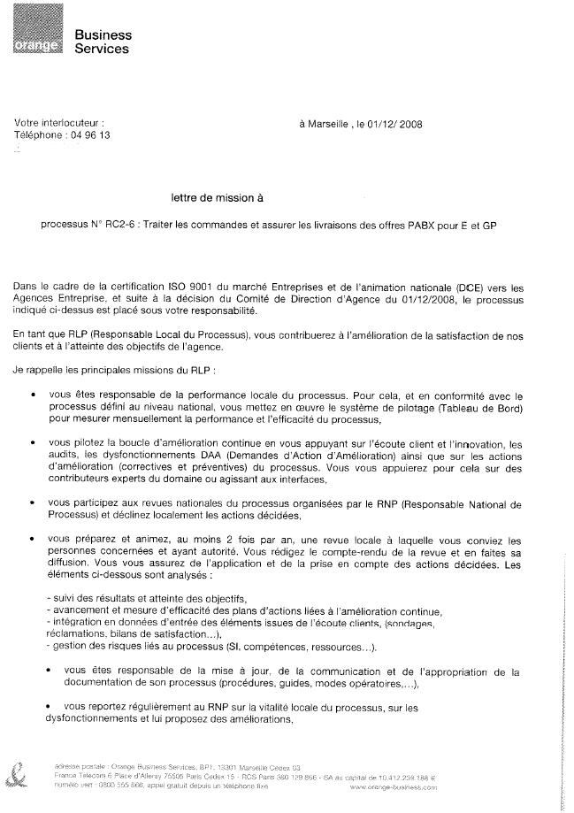 ANNEXE 6 – LETTRE DE MISSION RLP PROCESSUS TRAITER LA COMMANDE ET ASSURER LA LIVRAISON DES PABX