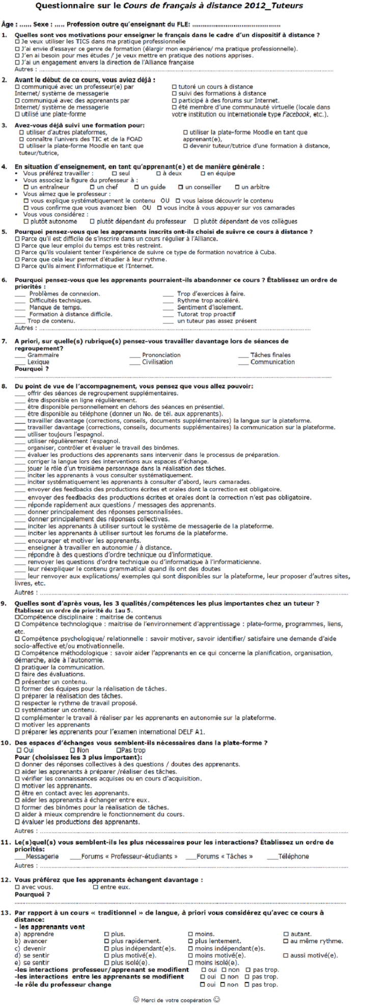 Annexe 7 : Questionnaire pour les tuteurs, leurs idées préalables admin 13 ans ago Page suivante : Annexe 8 : Questionnaire pour les apprenants, les idées préalablesRetour au menu : Gestion des interactions dans un dispositif hybride : rôles et stratégies des tuteurs. Le cas du présentiel réduit de l’Alliance française de La Havane