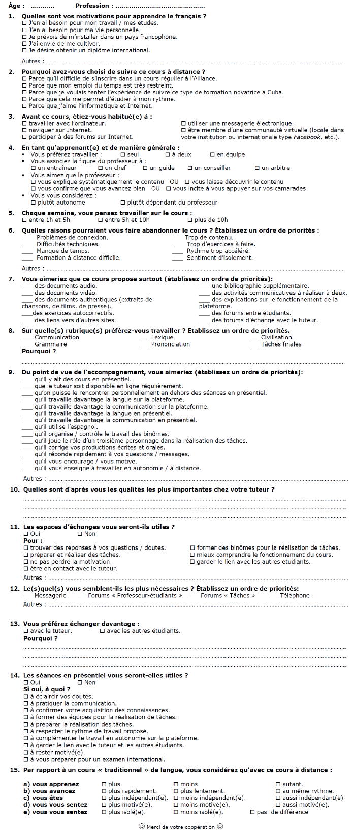 Annexe 8 : Questionnaire pour les apprenants, les idées préalables admin 13 ans ago Page suivante : Annexe 9 : Questionnaire pour les tuteurs: leurs idées sur le cours en avalRetour au menu : Gestion des interactions dans un dispositif hybride : rôles et stratégies des tuteurs. Le cas du présentiel réduit de l’Alliance française de La Havane