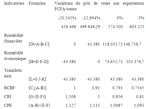 Tableau n°24 : Effet des variations du prix de vente à l’exportation sur les indicateurs de la MAP de la commercialisation