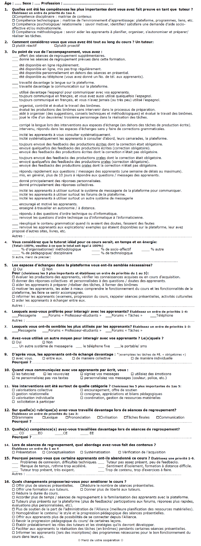 Annexe 9 : Questionnaire pour les tuteurs: leurs idées sur le cours en aval admin 13 ans ago Page suivante : Annexe 10 : Questionnaire sur le cours de français à distance 2012_après le coursRetour au menu : Gestion des interactions dans un dispositif hybride : rôles et stratégies des tuteurs. Le cas du présentiel réduit de l’Alliance française de La Havane