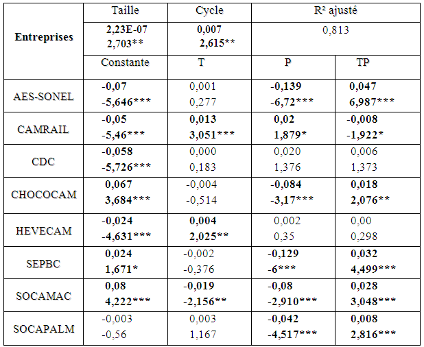 Les coefficients de la variable TP sont positifs pour sept (7) entreprises sur huit (8) de l’échantillon. Toutefois, ils ne sont positifs et significatifs que pour cinq (5) entreprises (AES- SONEL, CHOCOCAM, SEPBC, SOCAMAC et SOCAPALM) ; inversement, ce coefficient est négatif et significatif pour une (1) seule entreprise (CAMRAIL). Ce qui veut dire qu’environ 62,5% des entreprises ont subi l’effet positif de la privatisation (effet seuil et effet dynamique) sur leur rentabilité globale.
