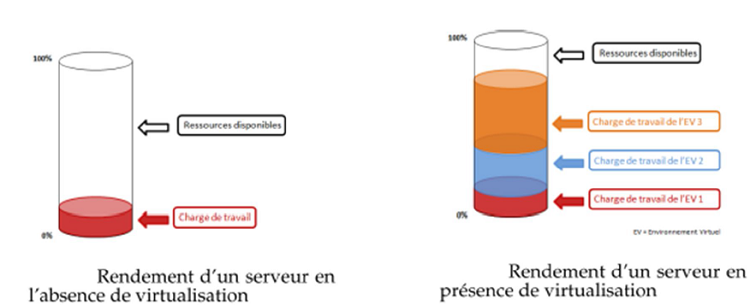 – La sous-exploitation des serveurs physiques (Santy, 2010). Traditionnellement, l’habitude consiste à employer un serveur par application. Cette méthode ne permet pas d’utiliser la puissance totale des serveurs et n’exploite qu’environ 5 à 15% de leur puissance (Santy, 2010). La figure 1.5 montre le rendement d’un serveur avec ou sans la virtualisation.