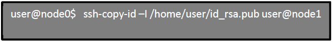 Après cette commande, les deux clés seront générées. Il convient ensuite de distribuer la clé publique à tous les nœuds distants souhaitant se connecter sans authentification par mot de passe. L’envoi de la clé publique générée pour le compte user de la machine node0 vers un compte utilisateur user sur une autre machine node1 se fera pas la commande :