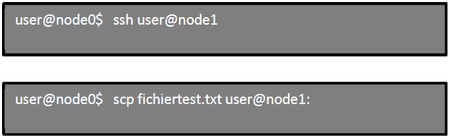 Il est dès lors possible de se connecter à cet hôte sur le compte user, en employant la commande ssh user@node1, ou d’envoyer un fichier à cet utilisateur par la commande scp nom_fichier user@node1: