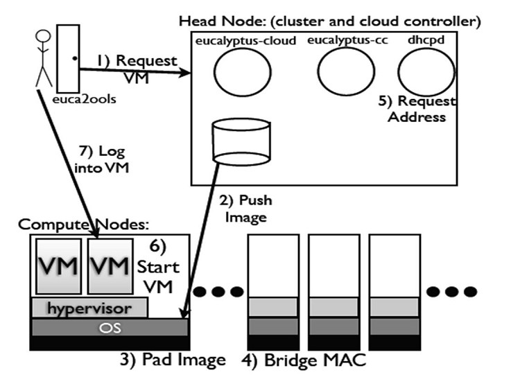 1. L’utilisateur fait une requête de machine virtuelle à travers le nœud central à l’aide de l’outil euca2ools.