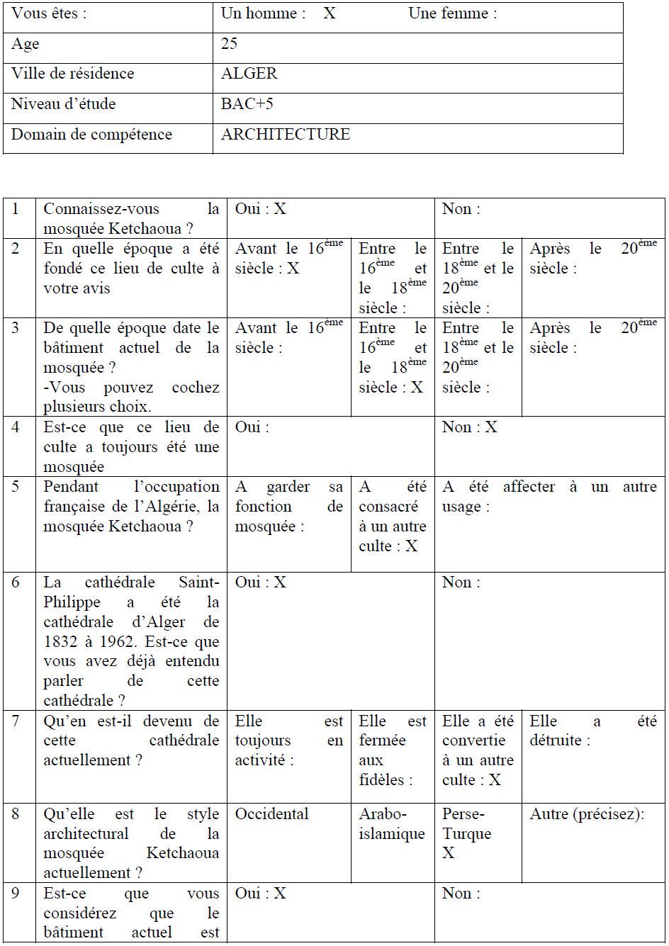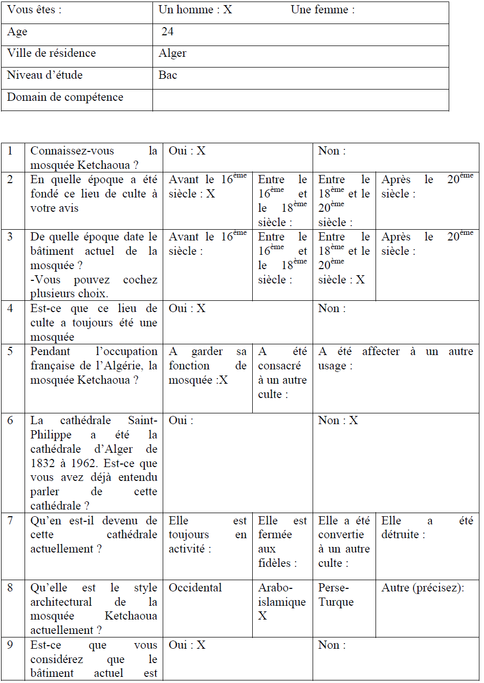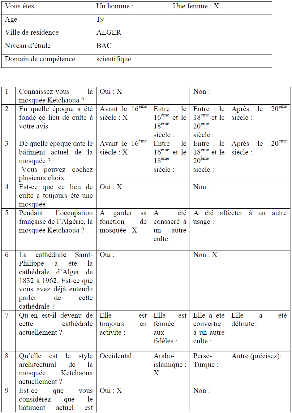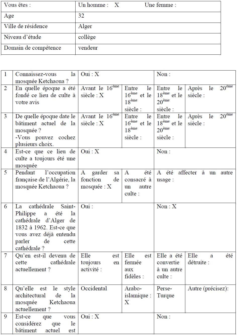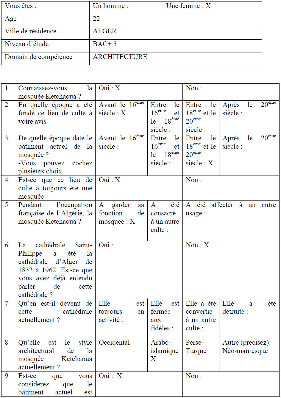 En raison de la courte durée de mon séjour à Alger, la distribution du questionnaire a été localisée essentiellement dans deux zones : à proximité de la mosquée Ketchaoua, et à l’école polytechnique d’architecture et d’urbanisme à Alger.