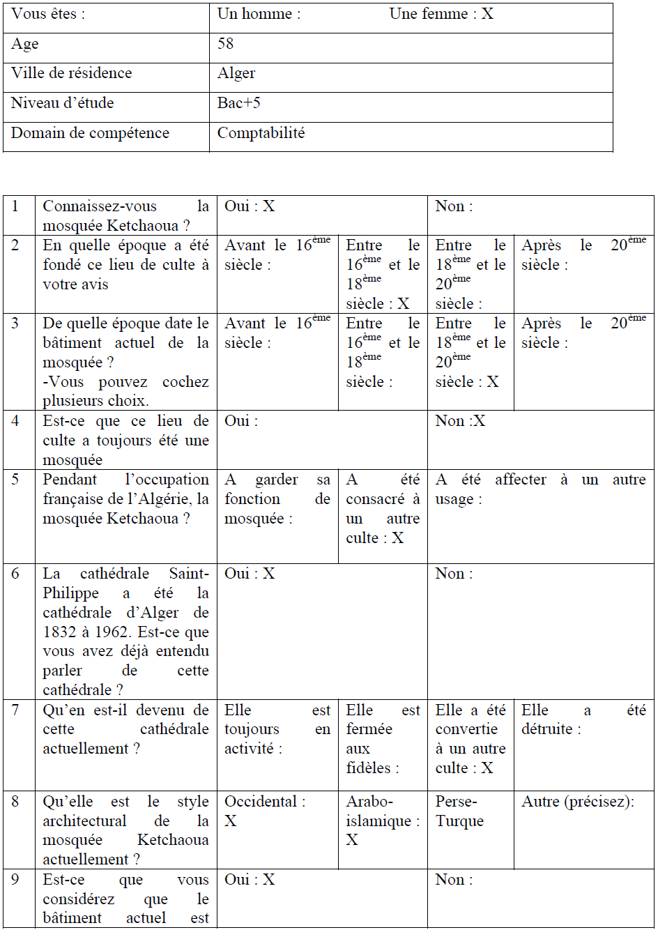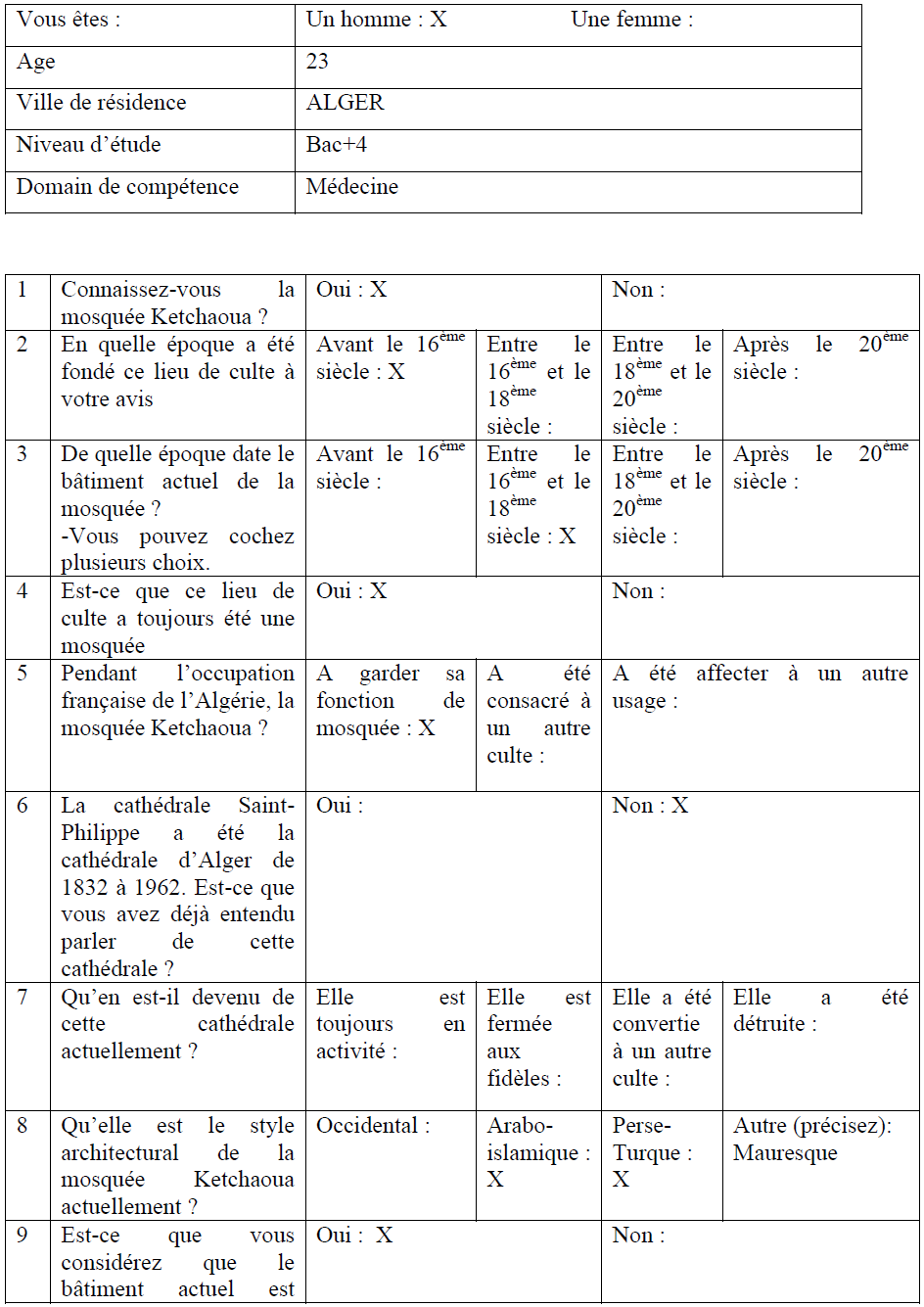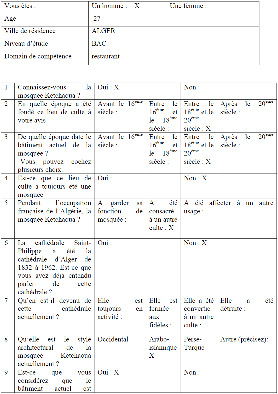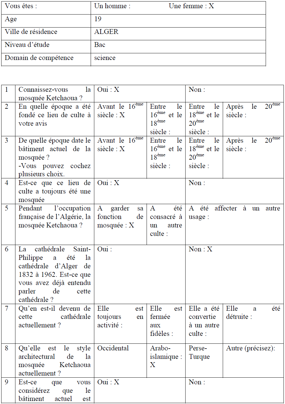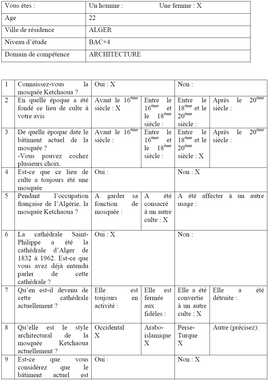 En raison de la courte durée de mon séjour à Alger, la distribution du questionnaire a été localisée essentiellement dans deux zones : à proximité de la mosquée Ketchaoua, et à l’école polytechnique d’architecture et d’urbanisme à Alger.