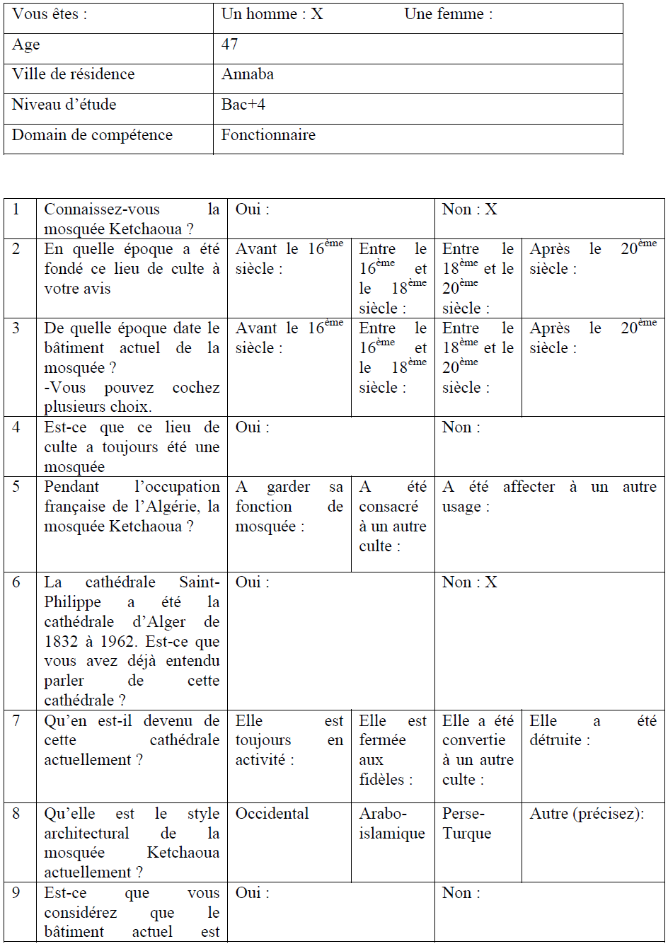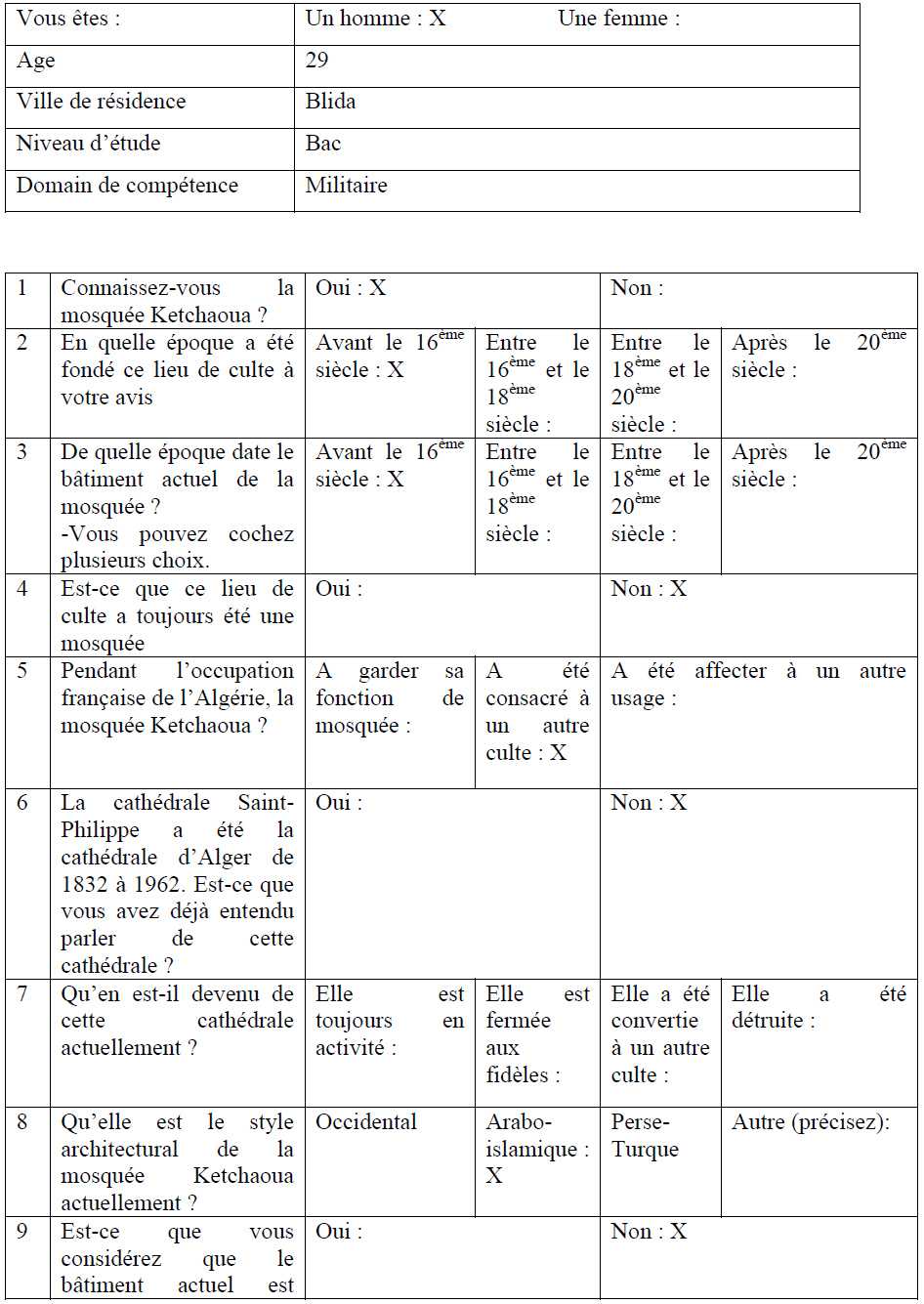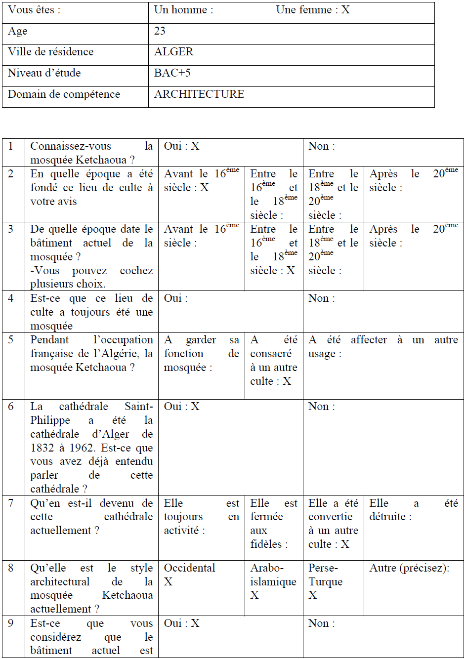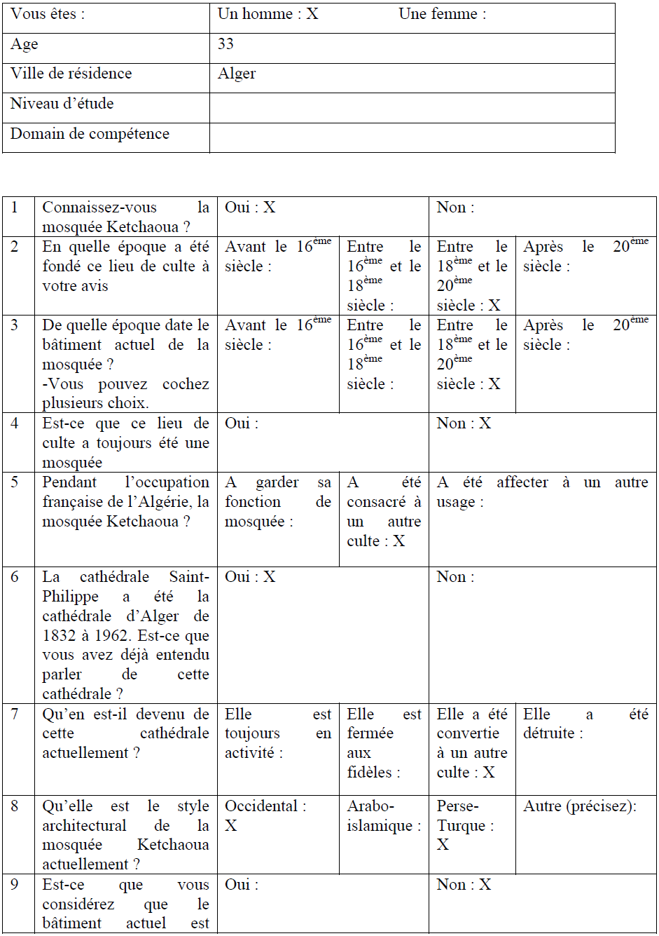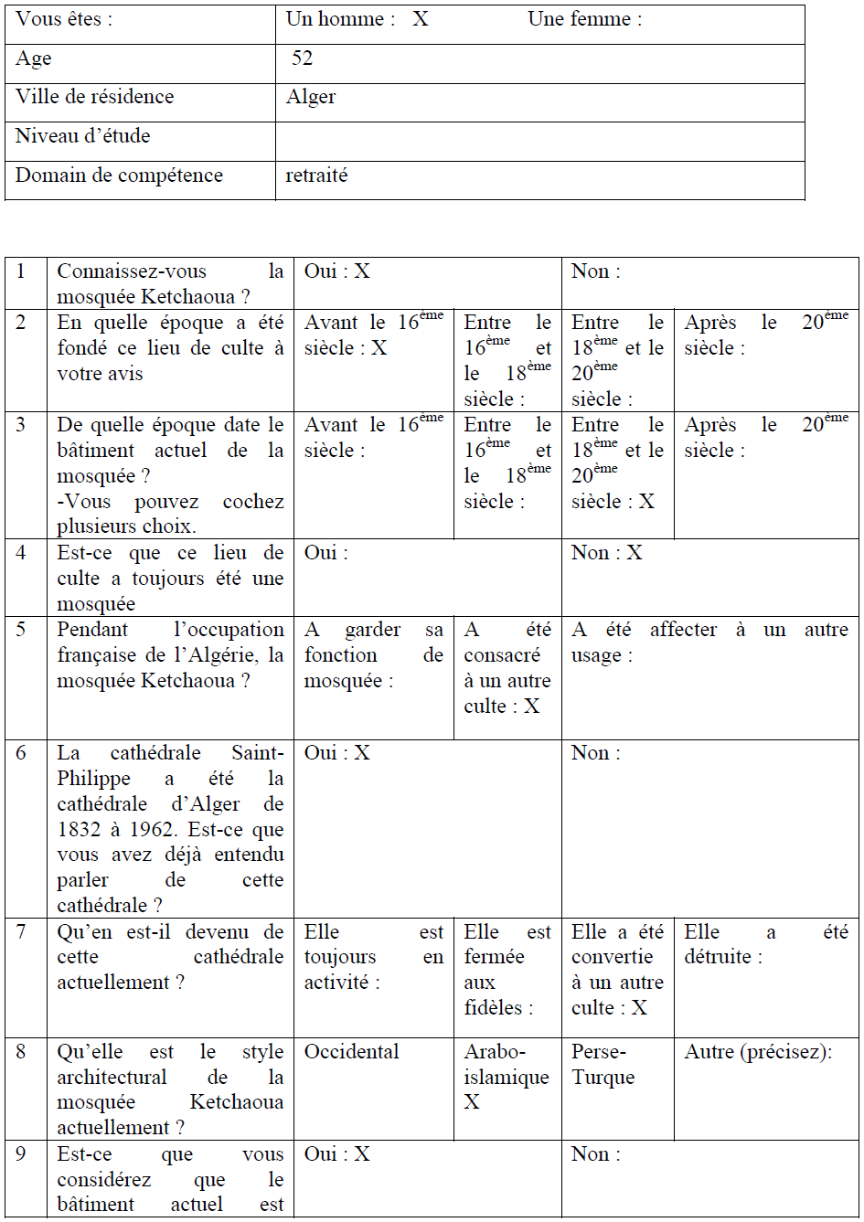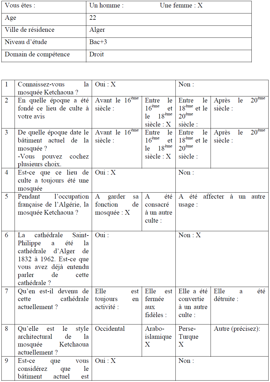 En raison de la courte durée de mon séjour à Alger, la distribution du questionnaire a été localisée essentiellement dans deux zones : à proximité de la mosquée Ketchaoua, et à l’école polytechnique d’architecture et d’urbanisme à Alger.