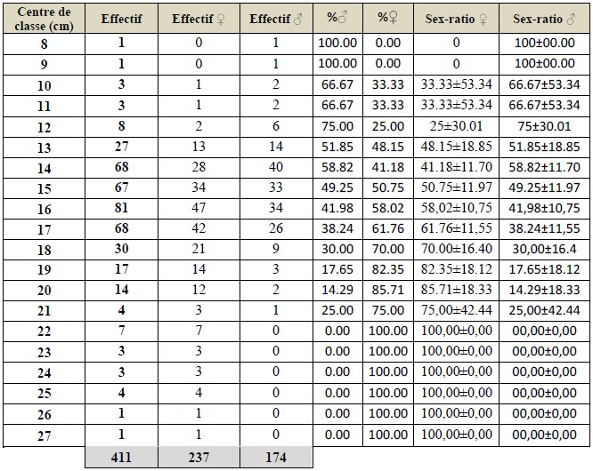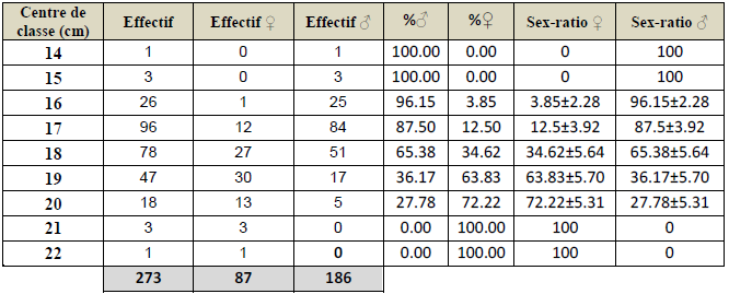 Tableau 1 : Distribution des Fréquences de taille des mâles et des femelles de C.linguatula