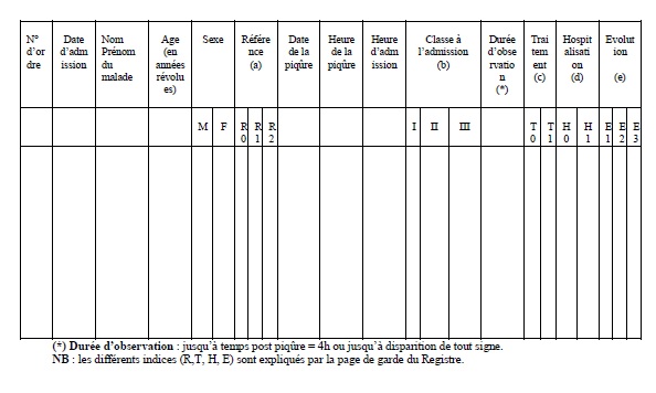 Annexe II : Le Registre admin 13 ans ago Page suivante : Annexe III : Le Relevé mensuelRetour au menu : Scorpionisme, Epidémiologie et Facteurs de Risque au Maroc : cas de la province de Khouribga