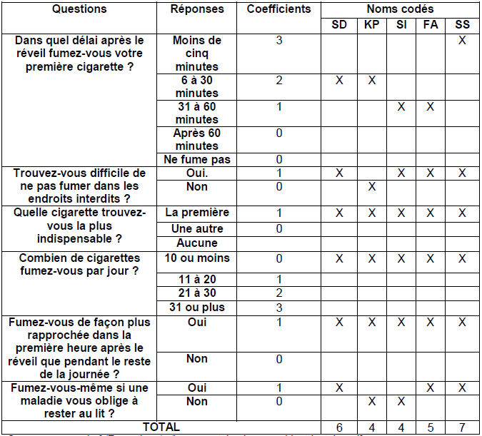 A la lumière des résultats du test de dépendance à la nicotine administré aux élèves, KP et SI ont un score de 04 équivalent à une dépendance moyenne à la nicotine. FA présente également une dépendance moyenne, mais supérieure d’un point (05) à celle de ses deux précédents camarades. Cette dépendance est encore plus élevée chez SD (06). SS émerge du groupe avec un score de 07 correspondant à une forte dépendance. Au vu de ce constat, il est encore plus nécessaire de pratiquer les activités éducatives destinées à les soustraire de l’envie incessante d’augmenter la dose de cigarette que constitue la dépendance, pour éviter les risques de pathologie.