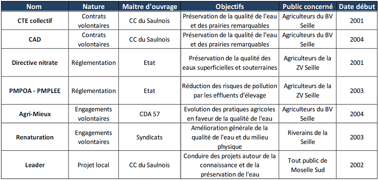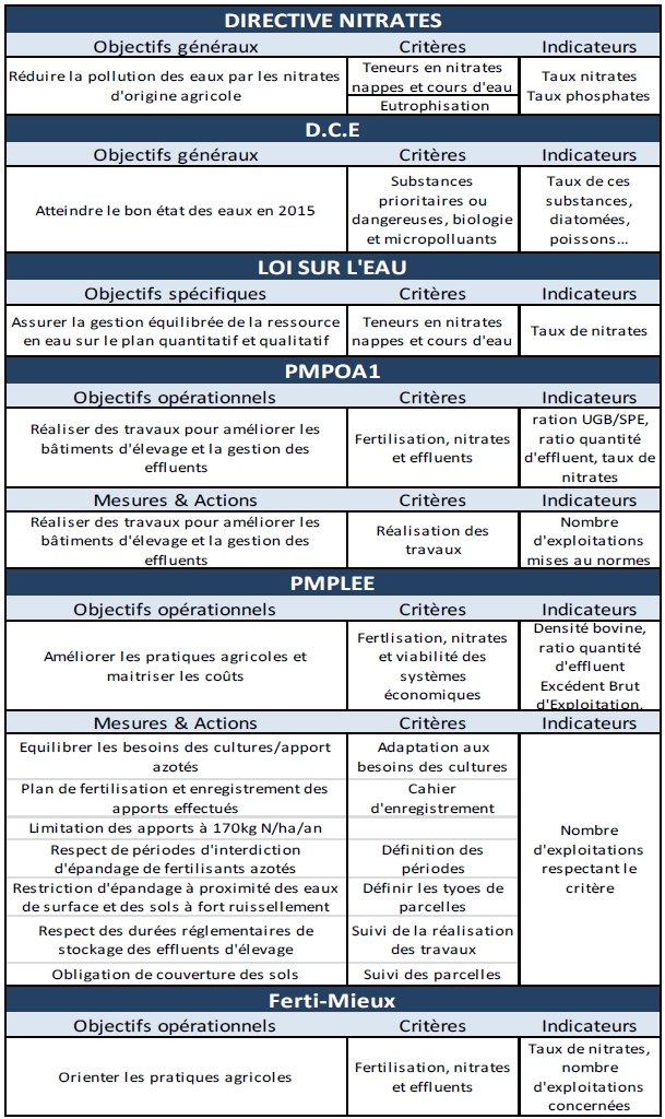 – Tableau de synthèse des réglementations et programmes agri-environnementaux (adapté de la Préfecture de Lorraine)