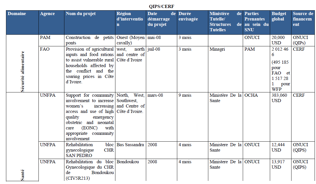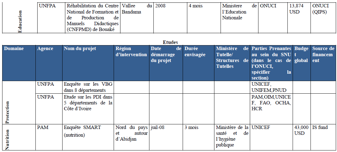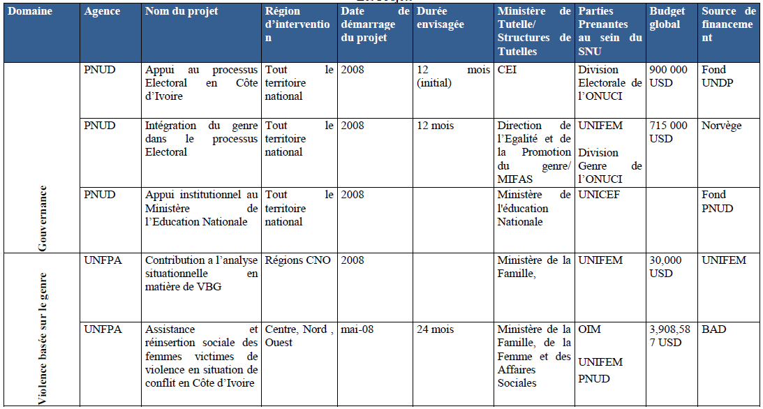 Annexe III : Les initiatives conjointes existantes et mises en oeuvre par le SNU en Côte d’Ivoire – Novembre 2008 admin 13 ans ago Page suivante : Annexe IV : LE TABLEAU DES ZONES ET DES LOCALITES À RISQUE AU PLAN DE LA COHESION SOCIALE A L’OUEST,Situation de Juin 2009(281)Retour au menu : Les enjeux de la transition politique et humanitaire : le cas de la crise politico-militaire et postélectorale en Côte d’Ivoire