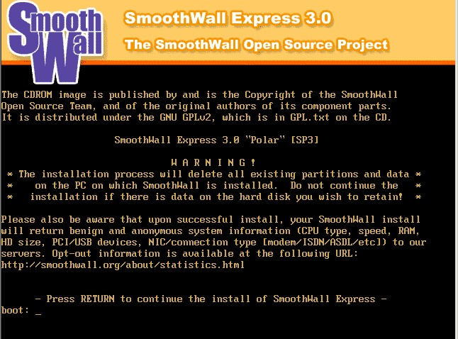 A ce stade le système nous prévient qu’il s’apprête à installer smoothwall sur notre disque dur. On clique sur ok