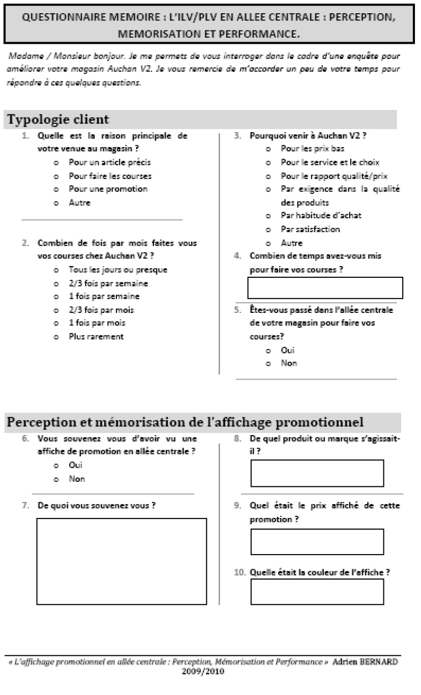 Annexe n°2 : Le questionnaire admin 13 ans ago Page suivante : Annexes n°3 : Les photos pour le questionnaireRetour au menu : L’affichage promotionnel en allée centrale : Perception, Mémorisation et Performance