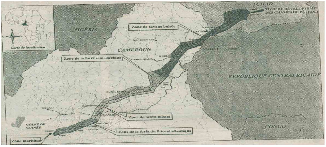 ANNEXE N°2 : ZONES DE FORET ET DE SAVANE AFFECTEES PAR LES TRAVAUX DE CONSTRUCTION DU PIPELINE admin 13 ans ago Source : Cameroon Tribue du 20 Oct. 2000, p. 8. Retour au menu : LA COTE ATLANTIQUE DU CAMEROUN ET LES ETATS SANS LITTORAL D’AFRIQUE CENTRALE : EVOLUTION ET DEFIS DE LA QUESTION D’ACCES A LA MER