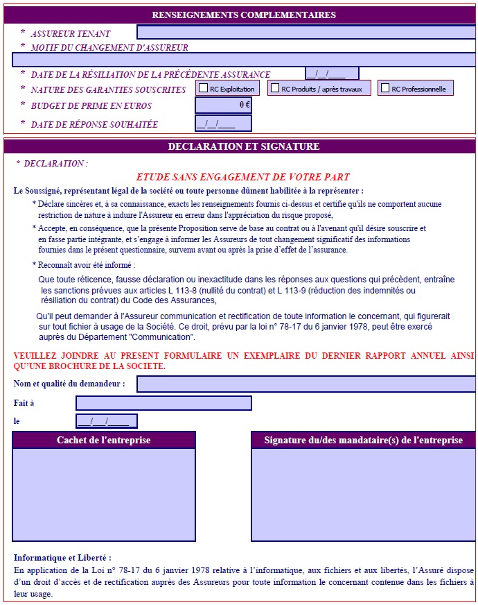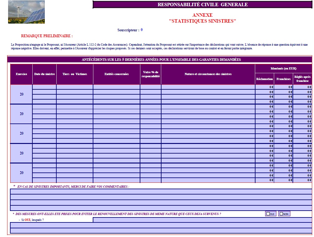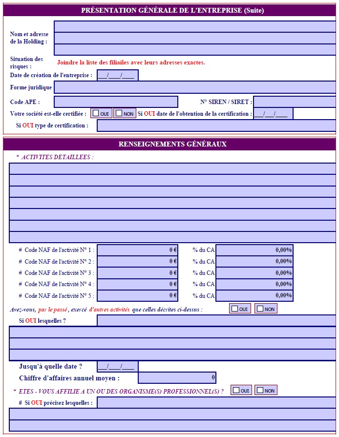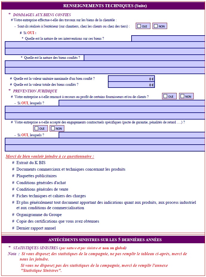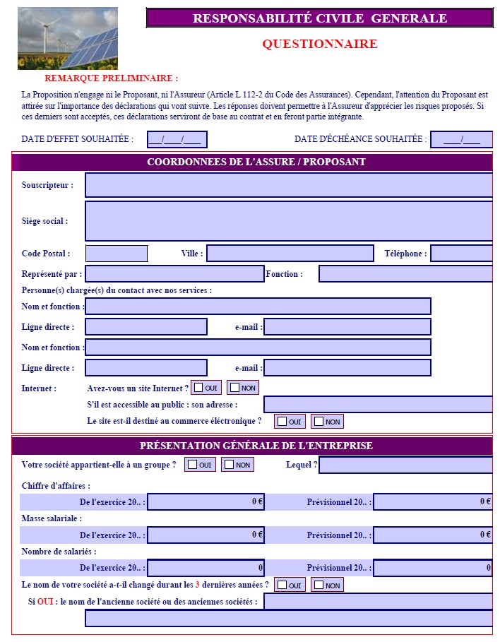 Questionnaire de Gras Savoye pour la prise de garantie en responsabilité civile générale