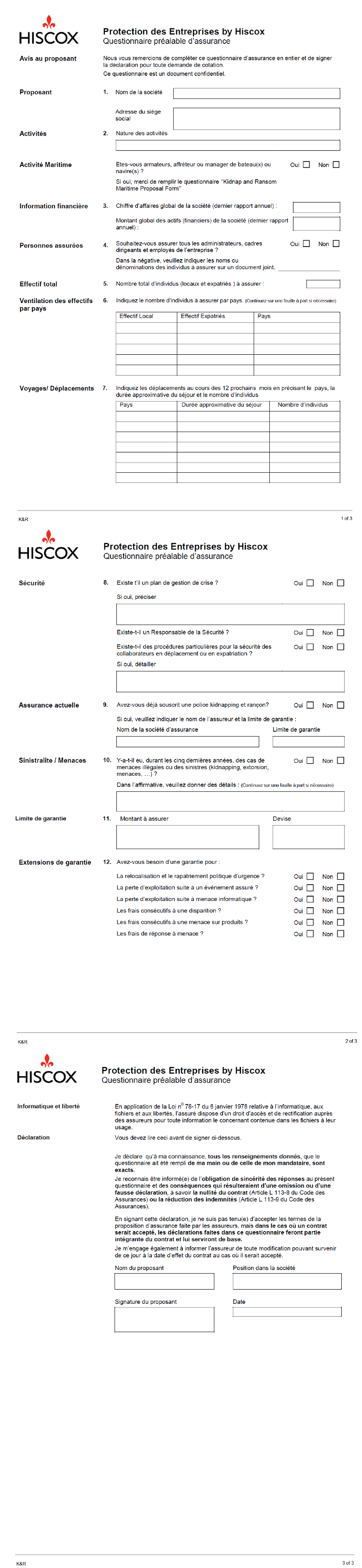Questionnaire préalable d'assurance, HISCOX