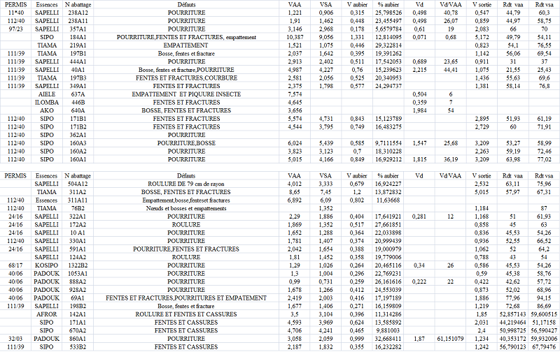 VAA : volume avec aubier ;VSA : volume sous aubier ; V aubier : volume aubier (VAA-VSA) ; Vd : volume perdu dû aux défauts ;Vd/ VAA : donne en pourcentge le volume perdu suite aux défauts ; Rdt VAA : rendement par rapport au volume avec aubier ( presenté dans le texte) ; Rdt rendement par rapport au VSA.