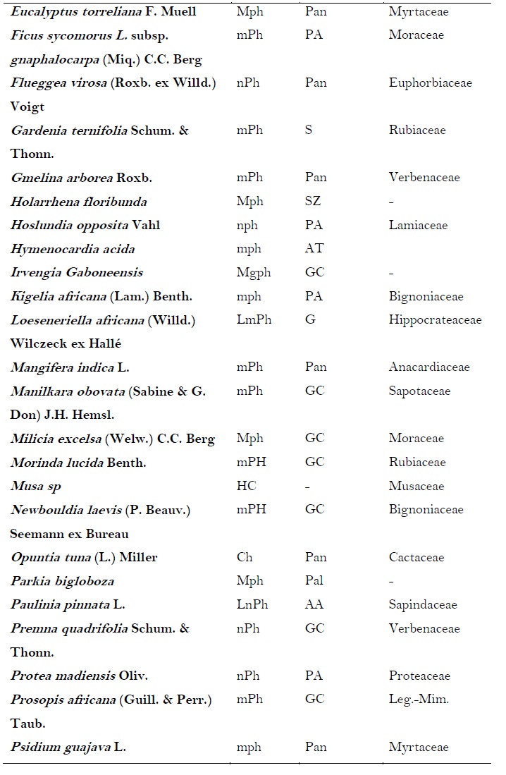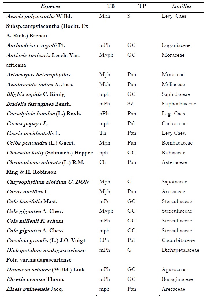 Annexes 2 :Liste floristiques admin 13 ans ago TB : Types Biologiques ; TP : Types phytogéographiques Page suivante : Annexes 3: Mise en place placeau pour l’invenatire et la collecte des données phytosociologiqueRetour au menu : Structure diamétrique et caractérisation de l’habitat des peuplements du Chrysophyllum albidum G.Don (Sapotaceae) sur le plateau d’Allada au Bénin