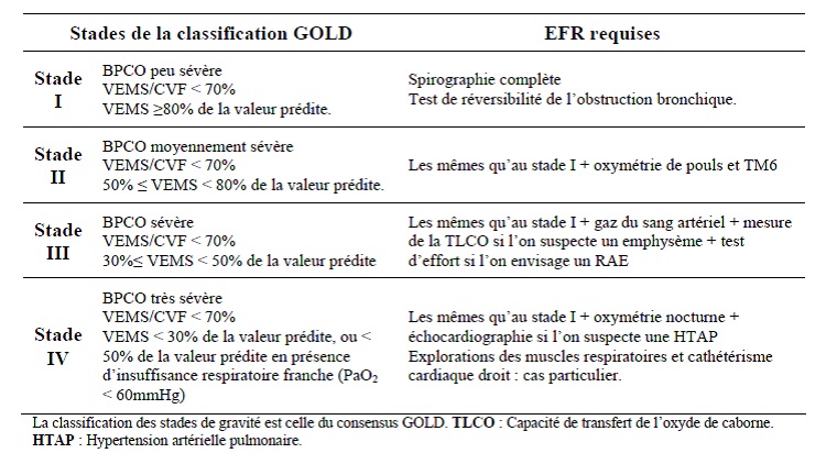 ANNEXE 1 : Classification des stades évolutifs de la BPCO avec les indications des EFR. [8]