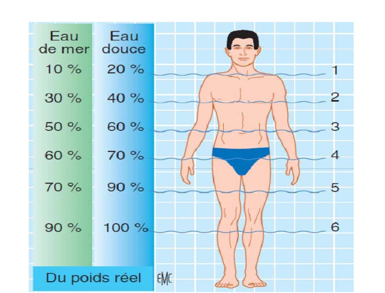 ANNEXE 4 : Variations du poids apparent suivant le niveau d’immersion. 1 : Immersion sternale ;