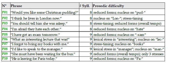number of the item; W = word; P = phrase; # Syll. = number of syllables that the item consists