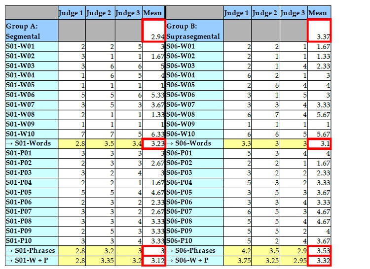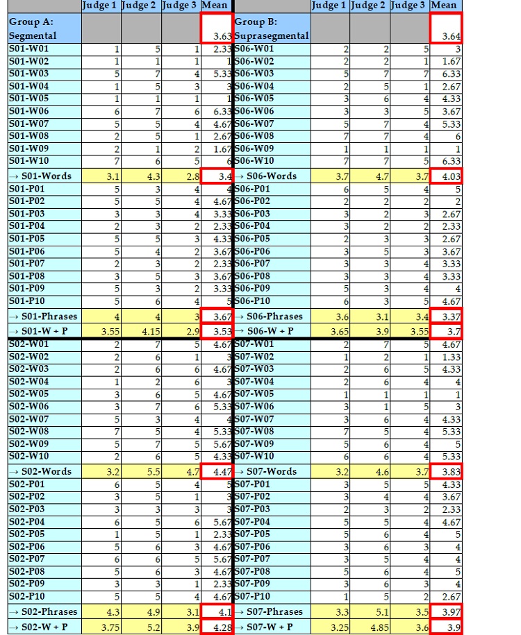 These are the scores (out of 7) that were given to each recording by the three listener-judges.