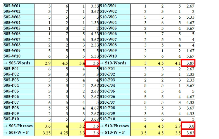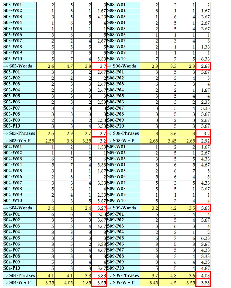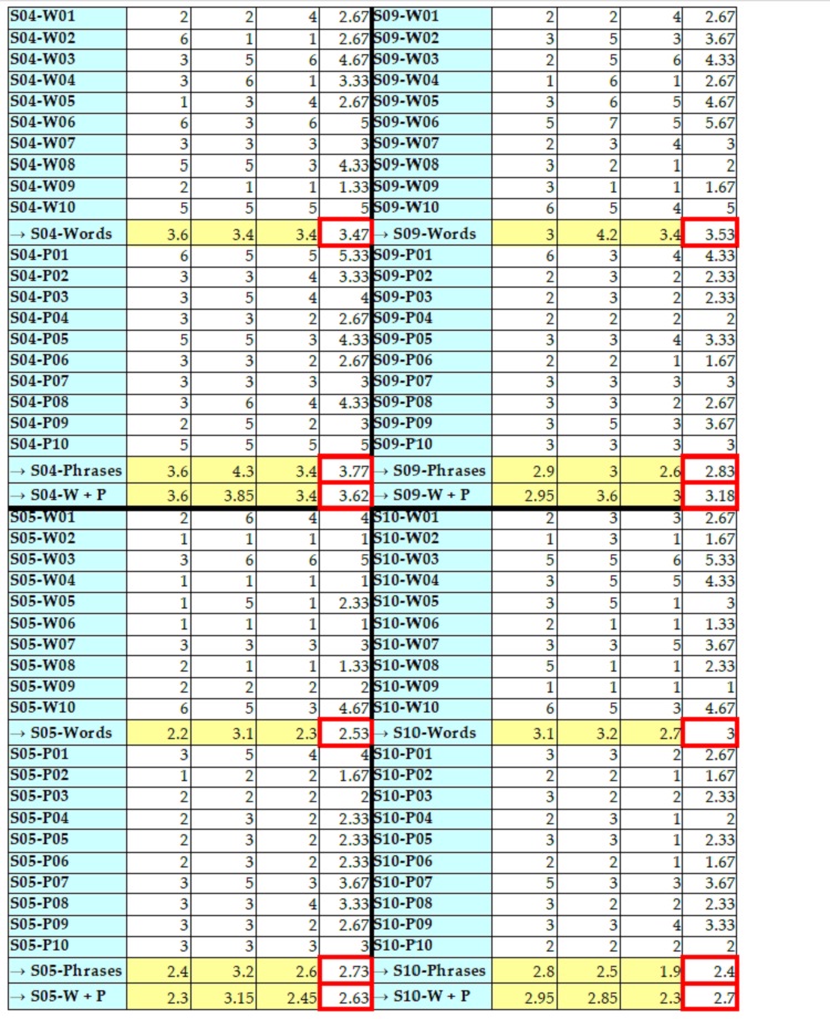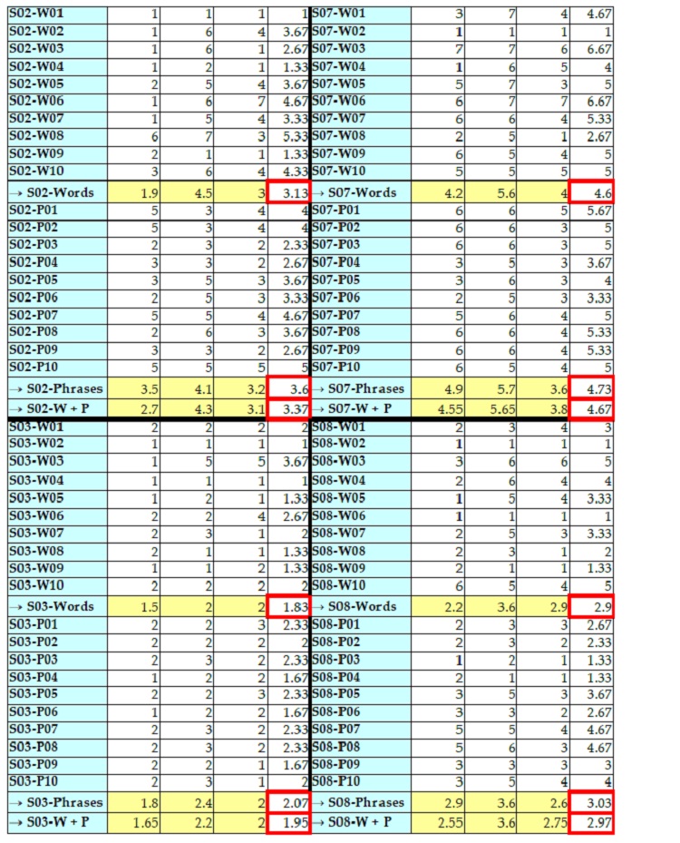 Subject n°00; W00 = Word n°00; P00 = Phrase n°00; ? = mean score.