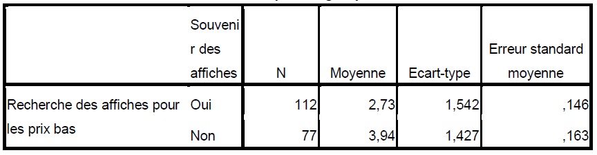 Dans le cas présent, nous avons une signification de 0,494. H0 est accepté et donc nous pouvons dire qu’il n’existe pas de relation entre la raison de la venue en magasin et le fait de mémoriser les prix contenus dans les affiches de promotion en allée centrale