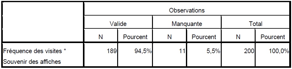 Etant donné que nous avons un sig de 0,147, nous pouvons conclure H1, soit le fait qu’il n’y a pas de relation entre la fréquence des visites et la mémorisation des affiches.