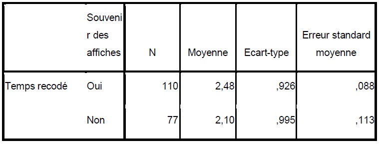 Donc, nous pouvons dire qu’il existe une relation entre le temps de course et la mémorisation des affiches. Plus le temps de course est important, plus la mémorisation est facile.