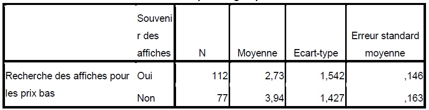 Dans le cas présent, nous avons une signification de 0,494. H0 est accepté et donc nous pouvons dire qu’il n’existe pas de relation entre la raison de la venue en magasin et le fait de mémoriser les prix contenus dans les affiches de promotion en allée centrale
