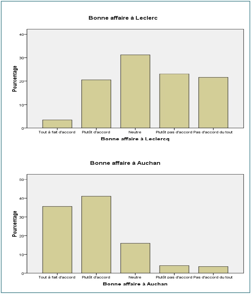 Pour Leclerc, les clients ne se prononcent pas sur les bonnes affaires avec 31% de réponse neutre. Mais, en moyenne les réponses tendent vers le fait que les clients ne sont plutôt pas d’accord sur le fait de faire des bonnes affaires