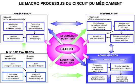 Le schéma ci-dessous (source HAS) récapitule le circuit du médicament. Il est intéressant de bien décomposer et différencier les prescripteurs, les dispensateurs et les administreurs.